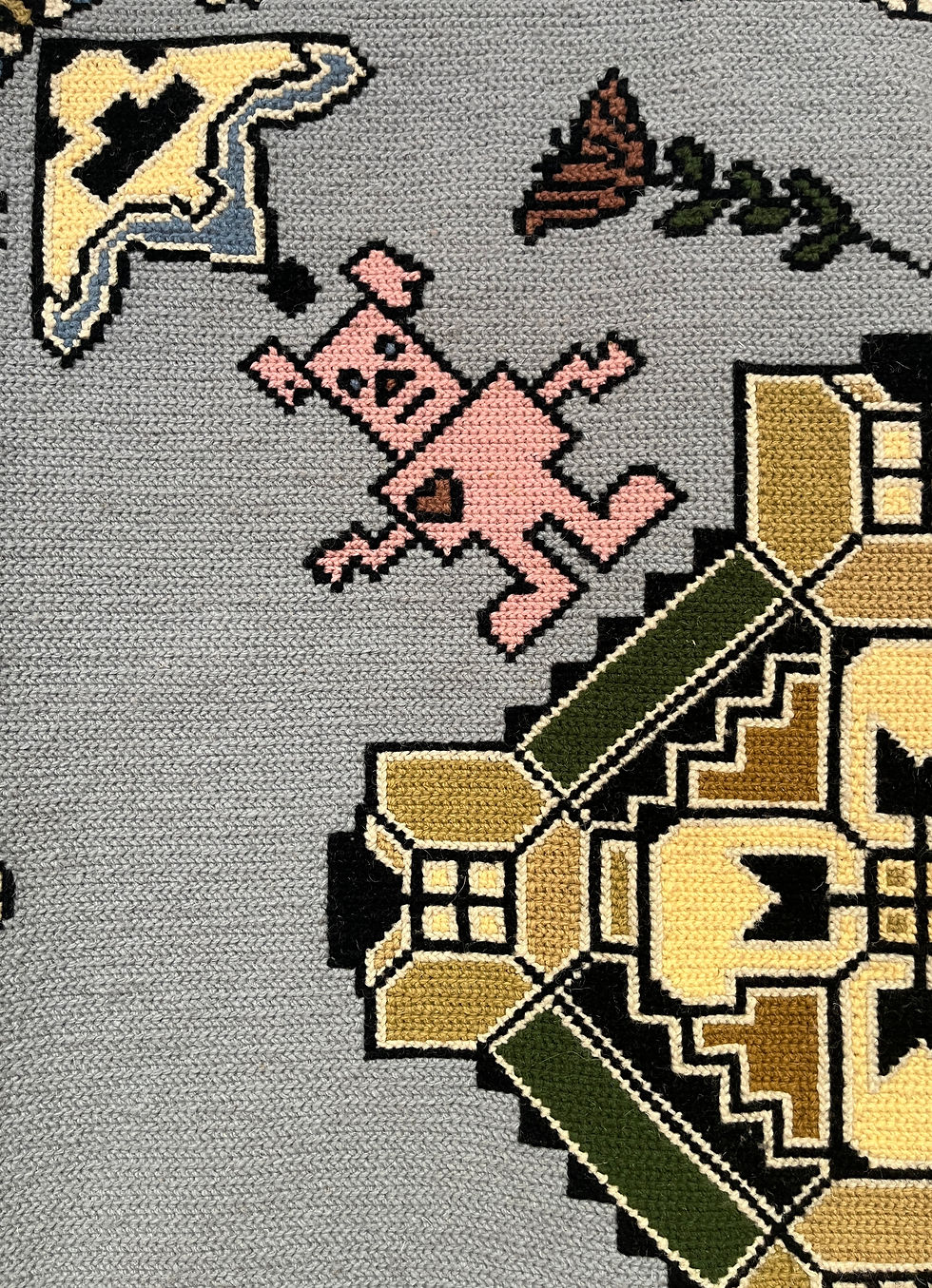 The works acknowledge the innocence of their origins while allowing new meanings to surface through craft, time, and distance. In this process, the carpets function as both personal archives and speculative maps — weaving together past and present, private memory and inherited visual traditions, into a renewed narrative of belonging.