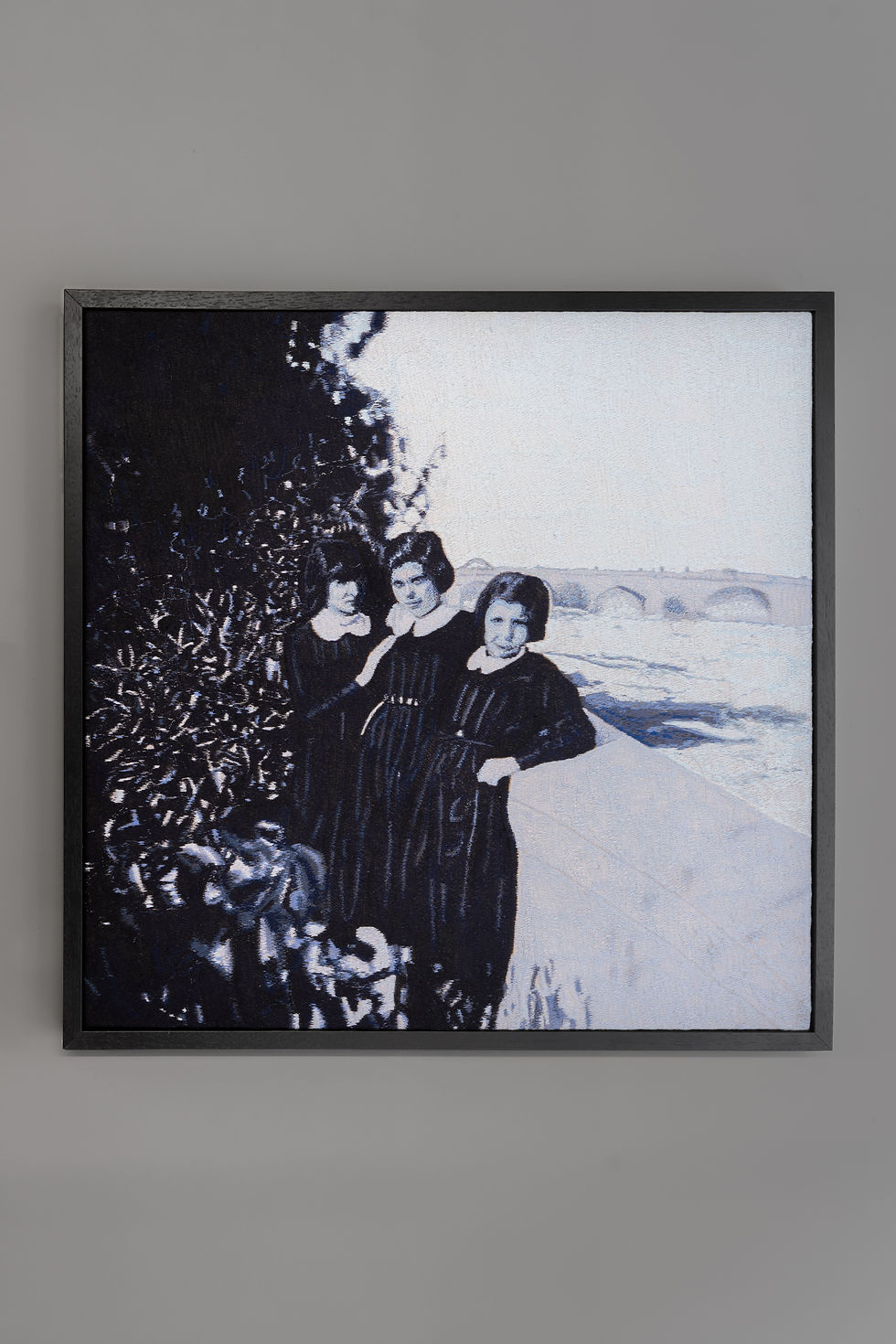 This sense of incompletion is intensified by the material form of the works. Rather than painted surfaces, Mustafa Boğa’s works are embroidered translations of photographic sources. Such translation is never neutral: in shifting from photograph to thread, something is inevitably altered or lost. Threads soften contours and slow down legibility. Displacing the documentary authority of the photograph, they turn what might have been evidence into something closer to recollection. They offer a remade moment, reconstructed through labour. Like memory itself, the image becomes fragmentary, certain details sharpen while others fade.